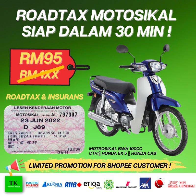 Pembaharuan insurans dan takaful motosikal online. Korang boleh renew road tax korang sekali dengan insurans kereta atau motosikal. Dapatkan perlindungan komprehensif untuk kehilangan atau kerosakan pada motosikal anda, termasuk pilihan tambahan bagi perlindungan kemalangan diri. Motosikal insurans perbaharui insurans motosikal anda secara "fast & easy" lengkap dengan 3 langkah. Oleh kerana nilai pasaran kenderaan anda lebih rendah daripada minimum, kami telah menetapkan jumlah nilai yang diinsuranskan kepada rm1000.